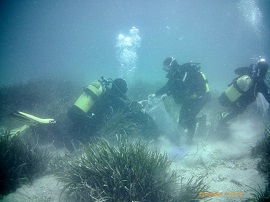 Una vez efectuada la foto de la Bandera desplegada, se inició la limpieza del fondo marino; con ayuda de unas bolsas de red se pudieron recoger residuos de todo tipo, cabos de barcos, redes, sedales, botellas de vidrio y hasta gafas de buceo se encontraron. La Sección en muchas de sus inmersiones incluye recogida de basura y así se contribuye a mantener un litoral Balear más limpio.