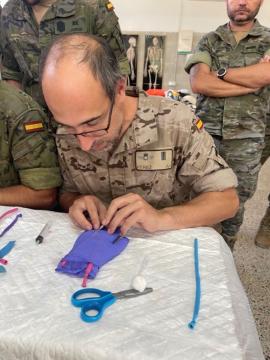 Por otro lado, dentro de la asignatura de Soporte Vital Avanzado impartida por la teniente Médico Sofía Cifuentes García y la teniente Enfermera Elena González Martínez, se realizaron dos prácticas básicas: técnica de vía intravenosa y técnica de vía intraósea. Estas prácticas en el Sistema Civil de Emergencias son realizadas por los facultativos presentes en las ambulancias; pero es importante que los alumnos conozcan estos procedimientos para estar familiarizados con los materiales utilizados y poder aportar esa ayuda caso de ser necesaria en los incidentes y emergencias reales.