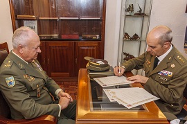 Seguidamente, se realizó la emotiva entrega del Bastón y Guion del Regimiento al Coronel entrante por parte del Coronel saliente, quien a continuación procedió a besar la Bandera de la Unidad en señal de despedida.