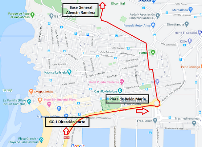- Autovía GC-1: Llegamos por la GC-1 a la rotonda "Plaza Belén María". Tomar la tercera salida en dirección plaza del “Ingeniero Manuel Becerra”. Desde la plaza del "Ingeniero Manuel Becerra" (parada de Guaguas Municipales), continuamos recto, dejando la gasolinera a nuestra derecha, subimos por la calle Atindana hasta cruzarnos con la calle Tecén, en la cual, giramos a la izquierda primero y luego a la derecha para tomar la calle Roque Nublo, al final de la misma, a la izquierda, subimos por calle Coronel Rocha hasta encontrarnos con la entrada principal de la Base “General Alemán Ramírez”, en su interior se encuentra el Regimiento "Canarias" nº 50.