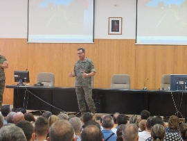 Simultáneamente y siguiendo la experiencia de los años anteriores, el Coronel Director, junto con el Jefe de Estudios, el Jefe de la Jefatura de Apoyo y Servicios y el Suboficial Mayor, recibieron a los familiares a quienes dirigieron unas palabras de bienvenida, y posteriormente unas breves explicaciones de las condiciones de vida y actividades que realizarán los alumnos en su estancia en el Centro.