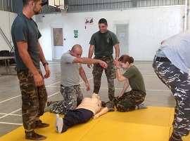 La Cabo española Angulo y la soldadao Salvadoreña, destinadas en el ROLE 1 de la BMC, dan un "Curso de Primeroas Auxilios" a las mujeres que trabajan en el hogar.