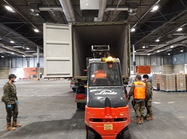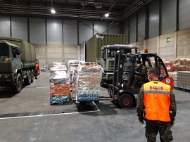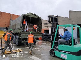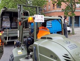 La Agrupación de Apoyo Logístico Nº11 transporta, procedente de Feria de Madrid - IFEMA, alimentos a la Parroquia de San José en Madrid. En un sólo día, ha distribuido 100.000 kg de alimentos y agua, además de 102 colchones y ropa de cama.