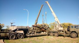 La Agrupación de Apoyo Logístico nº 11 (AALOG nº 11), de la Brigada Logística (BRILOG), ha apoyado con dos grúas para la carga y descarga de un cañón de artillería que ha sido transportado desde el Acuartelamiento “Teniente Muñoz Castellanos” a la Base San Pedro (Colmenar Viejo, Madrid).