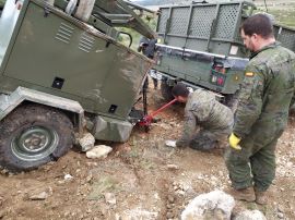 El Grupo de Mantenimiento II/11 realiza periódicamente jornadas para incrementar los conocimientos en recuperación y evacuación de vehículos averiados o siniestrados, bajo amenaza hostil o en condiciones extremas, de los contingentes que despliegan en las distintas Zonas de Operaciones. Esta vez, la práctica ha pasado a ser una recuperación difícil y real por el personal que imparte esas jornadas. ¡Buen trabajo!