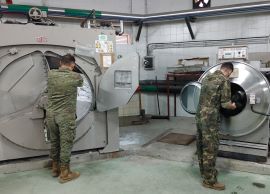 El personal civil Baquedano, el soldado Carramolino y el soldado Galán son los encargados de manejar, mantener y realizar el apoyo con las lavadoras industriales de gran capacidad, las secadoras, las máquinas de planchado, las máquinas de plegado,…de las que se dispone en la lavandería en instalaciones fijas de la AALOG 11, realizando un excelente trabajo del que las UCO apoyadas se muestran muy satisfechas y agradecidas. ¡Los demás primero!