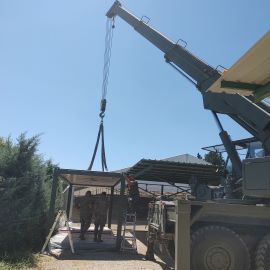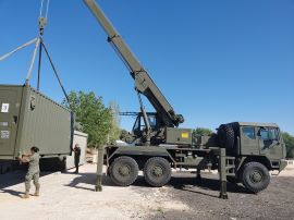 Finalmente, con el apoyo de la grúa de la AALOG 11, el personal del REI 11 ha realizado el montaje de un contenedor de 20´ habitáculo TRIMO C/S, contenedor prefabricado y transportado en piezas, que ha sido instalado y montado en el Centro Deportivo.