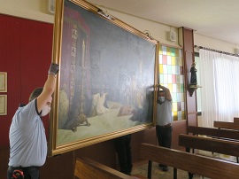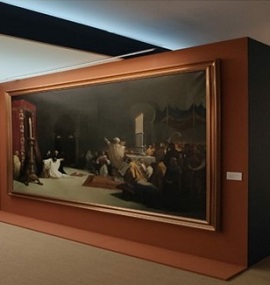 La reproducción cedido por la Academia, habitualmente expuesta en su capilla, a pesar de no alcanzar las grandes dimensiones del original, de más de 7 metros de ancho, sigue siendo, como se puede apreciar en la fotografía, un lienzo de gran formato (276 x 188 cm.), que difícilmente pasará inadvertido, tanto por su tamaño como por su temática, a todos aquellos que se decidan a visitar la exposición.