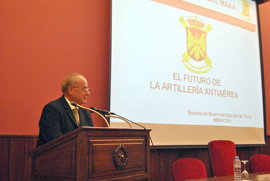 Durante su intervención, el TTE. GRAL MIRÓ, hizo un recorrido por la historia de nuestra Artillería Antiaérea, desde su inicio en el año 1898, cuando el Capitán Patricio de Antonio, derribó un globo aerostático de observación del ejército estadounidense, con dos cañones Krupp de 75 mm. Igualmente el Cor. Pantaleón, presentó su visión sobre la transformación de la Artillería Antiaérea española para que pueda responder con eficacia a las necesidades actuales que puedan surgir de los conflictos abiertos.