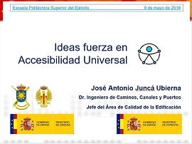 El pasado día 9 de mayo tuvo lugar en la Escuela Politécnica Superior del Ejército la conferencia titulada “Ideas fuerza en la Accesibilidad Universal” impartida por D. José Antonio Juncá Ubierna, Jefe del Área de Calidad de la Edificación del Ministerio de Fomento. A la conferencia asistieron profesores y alumnos de la Escuela.