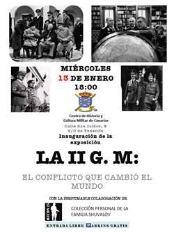 El Centro de Historia y Cultura Militar de Canarias organiza la exposición “la II GM: El Conflicto que cambió el Mundo” que se inaugurará el próximo miércoles 13 de enero a las 18:00 h, el en el Patio de Armas de este Fuerte de Almeyda. A continuación se obsequiará a los asistentes con un brindis en la Pérgola por el éxito de la misma.