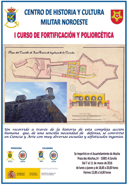 Se convoca al I Curso de Fortificación y Poliorcética que se impartirá en la ciudad de A Coruña por ponentes del Instituto de Historia y Cultura Militar de Madrid y ponentes de A Coruña y Ferrol, el próximo 7 a 11 de marzo (a.i.) en el Acuartelamiento de Atocha, organizado por el Centro de Historia y Cultura Militar Noroeste, patrocinado por la Fuerza Logística Operativa y por la Asociación de Historia y Cultura Militar Noroeste y con la colaboración del Instituto de Historia y Cultura Militar y de la Asociación de Historia y Cultura Militar Noroeste.