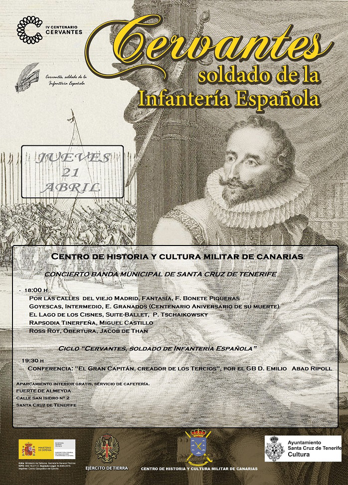 Continuamos celebrando el IV Centenario de nuestro más universal literato bajo el lema “Cervantes. Soldado de Infantería Española”. Todo un capítulo del Quijote está dedicado al brillante discurso que el Ingenioso Hidalgo pronuncia sobre la oposición entre las armas y las letras, contraponiendo los méritos y trabajos del soldado a los del letrado. Para Cervantes el ejercicio de las armas era el más honroso y el más digno, por lo que don Quijote proclama en una ocasión que “no hay otra cosa en la tierra más honrada ni de mayor provecho que servir a Dios, primeramente, y luego a su rey y señor natural, especialmente en el ejercicio de las armas, por las cuales se alcanzan, si no más riquezas, a lo menos, más honra que por las letras, como yo tengo dicho muchas veces”.