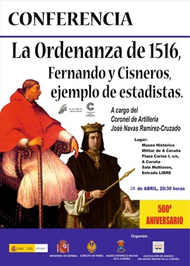 El Museo Histórico Militar de A Coruña con la colaboración de la Asociación de Amigos del Museo organizan la conferencia “La Ordenanza de 1516. Fernando y Cisneros, ejemplo de estadistas” con ocasión de su 500 aniversario. Que será impartida por el Coronel de Artillería D. José Fernando Navas Ramirez-Cruzado.