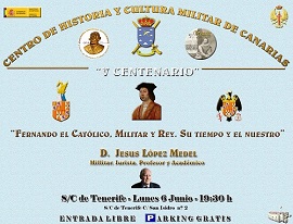 Dentro de las actividades de la Cátedra “General Gutierrez”, codirigida por la ULL y el Centro de Historia y Militar de Canarias (Tenerife), se impartirá la conferencia "Fernando el Católico, Militar y Rey. Su Tiempo y el Nuestro", por D. Jesús López Medel, Jurista, profesor, académico y militar.