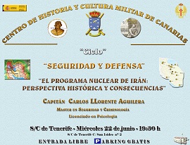 de Conferencias sobre Seguridad y Defensa: El Norte de África y Oriente Medio con la interesantísima conferencia "El Programa Nuclear de Irán: Perspectiva Histórica y Consecuencias", que será impartida por D. Carlos Llorente Aguilera, psicólogo y master en Ciencias de Seguridad y Criminología,