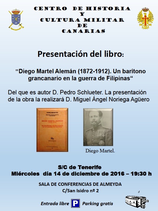 En el Centro de Historia y Cultura Militar de Canarias D. Miguel Angel Noriega Agüero presenta el libro “Diego Martel Alemán (1872-1912). Un barítono grancanario en la guerra de Filipinas” cuyo autor es D. Pedro Schlueter.
