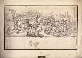 • un grabado en el que se aprecia una escena de carga de caballería