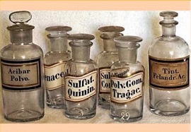 • Imagen de una serie de frascos usados antiguamente en las famacias