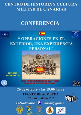 Enmarcada en el Ciclo Seguridad y Defensa de la Cátedra General Gutierrez, el Centro de Historia y Cultura Militar de Canarias presenta la conferencia “Operaciones en el Exterior, una Experiencia Personal” que será impartida por el Coronel D. Federico Bordas Martinez