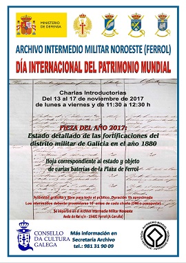 Con motivo de la celebración del Día Ínternacional del Patrimonio Mundial el próximo 16 de noviembre, el Archivo Intermedio Militar Noroeste con sede en el Ferrol, ofrece una serie de charlas diarias, abiertas al público e ilustradas con documentación de sus depósitos