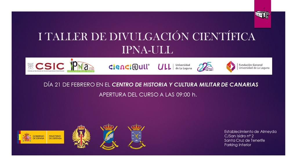 El Instituto de Productos Naturales y Agrobiológico y el Consejo Superior de Investigaciones Científicas (IPNA-CSIC), conjuntamente con el Centro de Historia y Cultura Militar de Canarias y la Universidad de La Laguna, presentan el día 21 de febrero en el Fuerte de Almeyda el I TALLER DE DIVULGACIÓN CIENTÍFICA IPNA-ULL. El día 22 se traslada al Instituto de Productos Naturales y Agrobiología del Consejo Superior de Investigaciones Científicas, La Laguna.