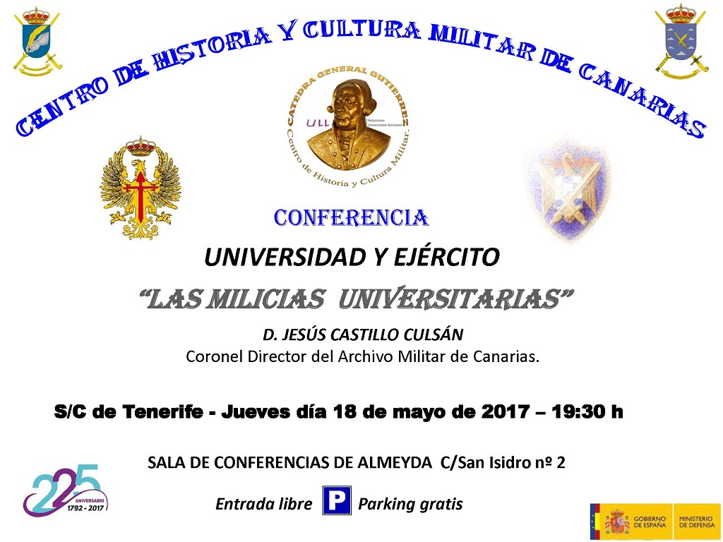 Enmarcada dentro del Ciclo Ejercito y Sociedad, correspondiente a la Catedra General Gutiérrez, el Centro de Historia y Cultura Militar de Canarias presenta la conferencia “Ejercito y Universidad, que será impartida por el coronel D. Jesús Castillo Culsán, Director del Archivo Intermedio Militar de Canarias.