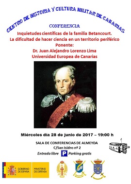 El Centro de Historia y Cultura Militar de Canarias presenta la conferencia "Inquietudes científicas de la familia Betancourt" que será impartida por el Doctor D. Alejandro Lorenzo Lima de la Universidad Europea de Canarias.