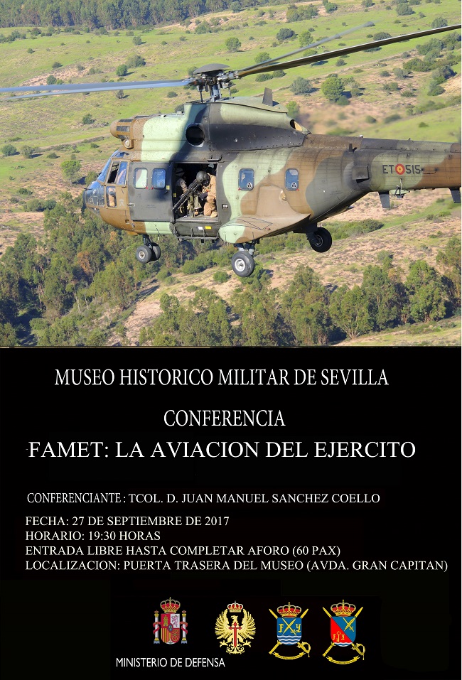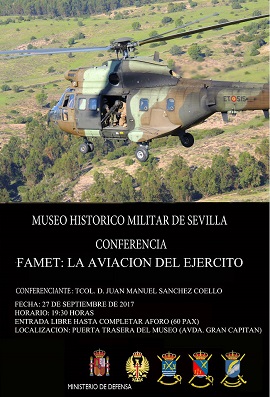 El Museo HIstórico Militar de Sevilla continuando con su programa cultura, presenta la conferencia "FAMET: La Aviación del Ejército" que será impartida por el Teniente Coronel D. Juan Manuel Sánchez Coello.