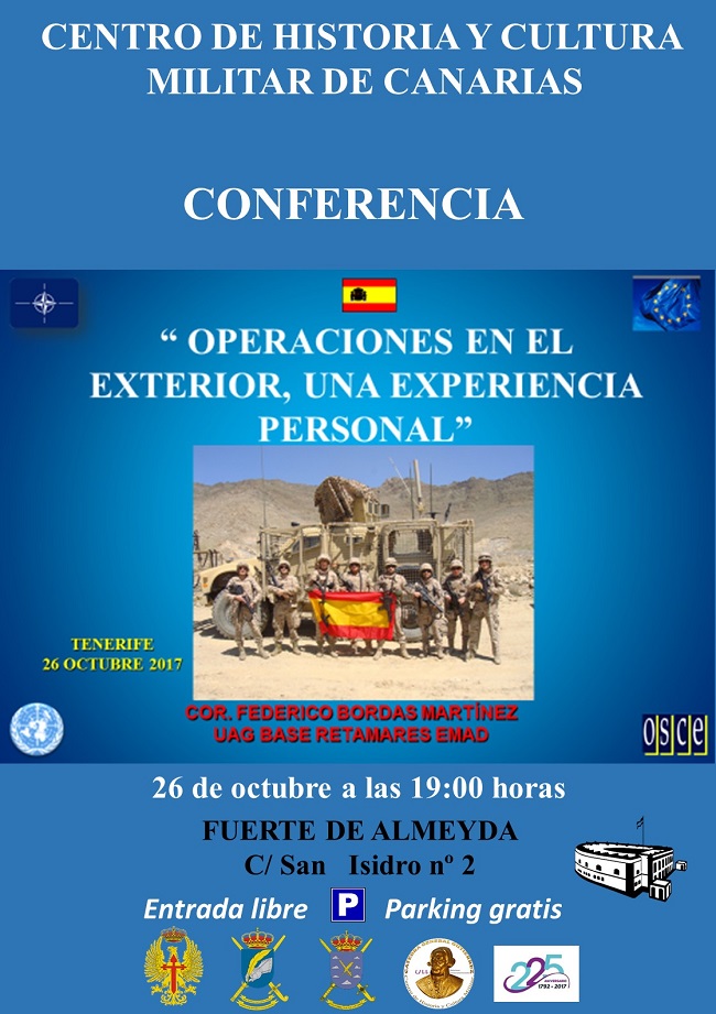 Enmarcada en el Ciclo Seguridad y Defensa de la Cátedra General Gutierrez, el Centro de Historia y Cultura Militar de Canarias presenta la conferencia “Operaciones en el Exterior, una Experiencia Personal” que será impartida por el Coronel D. Federico Bordas Martinez .
