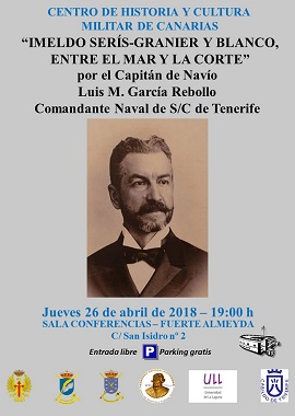 El Centro de Historia y Cultura Militar de Canarias presenta, en el marco de la Cátedra General Gutierrez, la confrerencia "Imeldo Serís-Granier Blanco, Entre el Mar y la Corte", que será impartida por el Capitán de Navío Luis Marcial García Rebollo, actual Comandante Naval de Santa Cruz de Tenerife.
