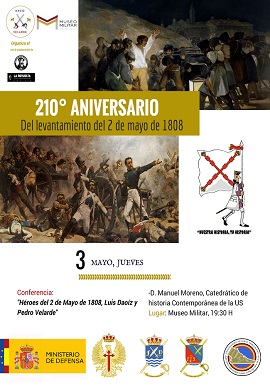 Con motivo del 210 aniversario del levantamiento del 2 de mayo de 1808 y organizada por la Asociación Juvenil de debate “Daoiz y Velarde” y el Museo Histórico Militar de Sevilla, se presenta la conferencia titulada “Héroes del 2 de mayo de 1808, Luis Daoiz y Pedro Velarde”, el conferenciante será el catedrático de historia contemporánea D. Manuel Moreno.