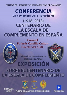 Con motivo del centenario de la Escala de Complemento. El Centro de Historia y Cultura Militar de Canarias presenta la conferencia “(1918-2018) Centenario de la Escala de Complemento en España”, que será impartida por el Coronel Director del Archivo Intermedio Militar de Canarias D. Jesús Castillo Culsán. Posteriormente se inaugurará una exposición relacionada con esta celebración y finalmente se servirá a los asistentes un vino de honor.