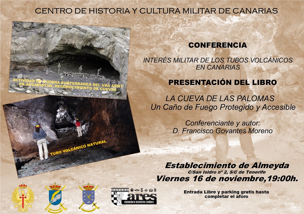 Organizada por la Delegación de Canarias de la Asociación de Reservistas Españoles y en la sala “General Gutierrez” del Establecimiento de Almeyda , tendrá lugar la conferencia “Interés Militar de los Tubos Volcánicos en Canarias” por D. Francisco Govantes Moreno, Teniente Reservista de Infantería de Marina, biólogo ambiental, zoólogo, psicopedagogo y profesor de Ciencias y Espeleología de la Consejería de Educación y Universidades del Gobierno de Canarias.