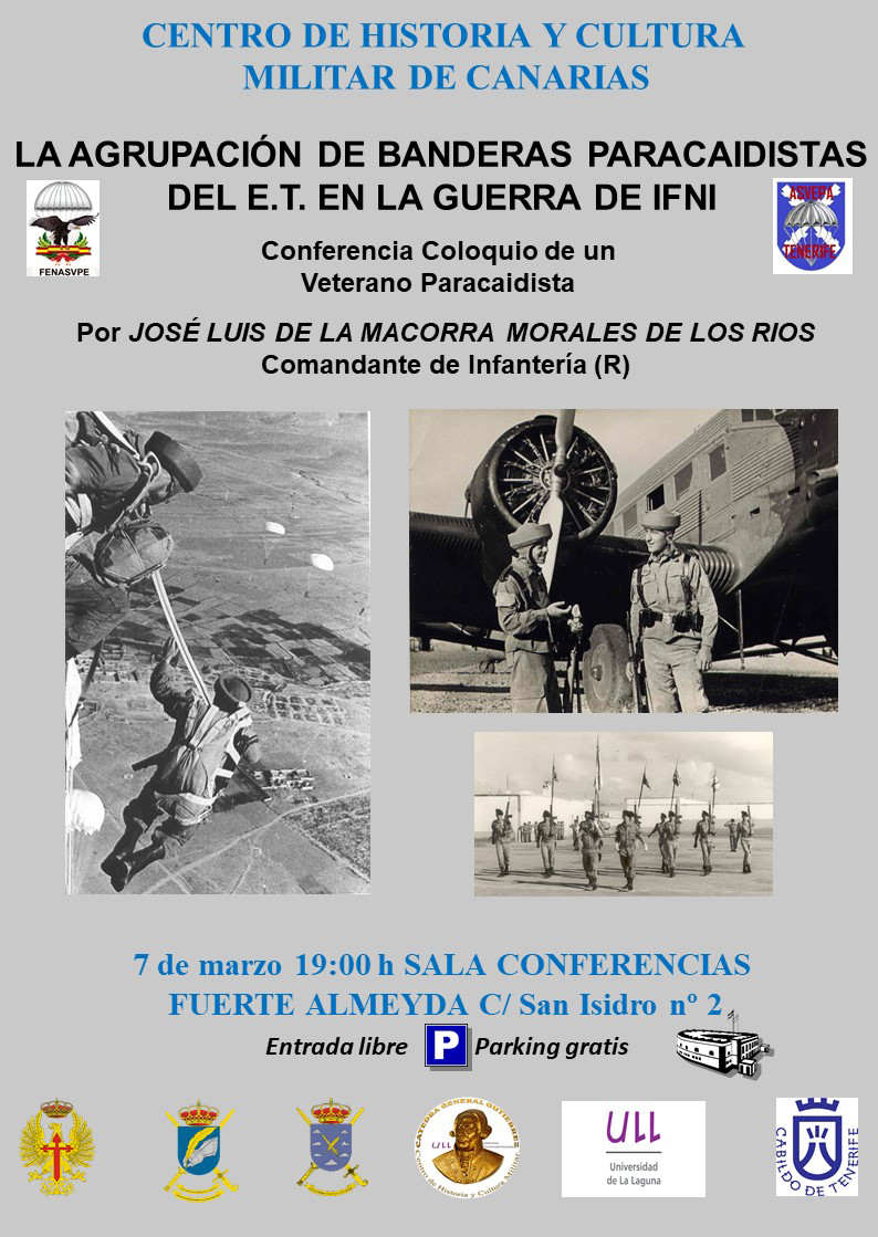 El próximo día 7 de marzo a las 19:00 horas y en el marco de colaboración del Centro de Historia y Cultura Militar de Canarias y la Cátedra General Gutiérrez con otras Instituciones, en este caso con la Asociación de Veteranos Paracaidistas de Santa Cruz de Tenerife, tendrá lugar la conferencia “La Agrupación de Banderas Paracaidistas del Ejército de Tierra en la Guerra de Ifni” a cargo del Comandante de Infantería (Retirado). Sr. D. José Luis de la Macorra Morales de los Rios. La misma tendrá lugar en la Sala de Conferencias del Fuerte de Almeyda.