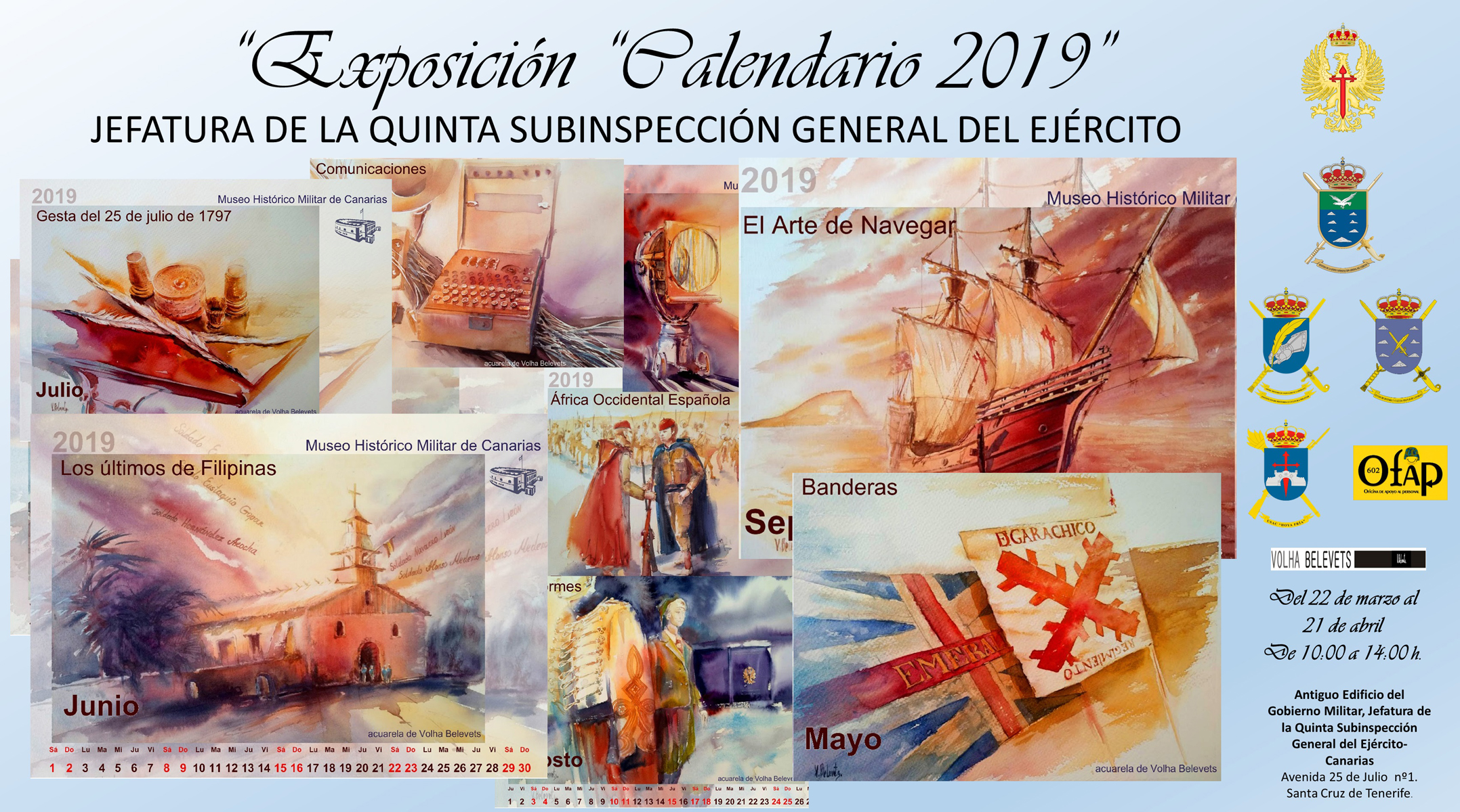 En el día de hoy, 22 de marzo, se ha inaugurado en el histórico palacio "Gobierno Militar de Santa Cruz de Tenerife", la exposición titulada ”Calendario 2019”. Este edificio, situado en el número uno de la céntrica calle 25 de Julio de Santa Cruz de Tenerife, es actualmente la sede de la Jefatura de la Quinta Subinspección General del Ejército.