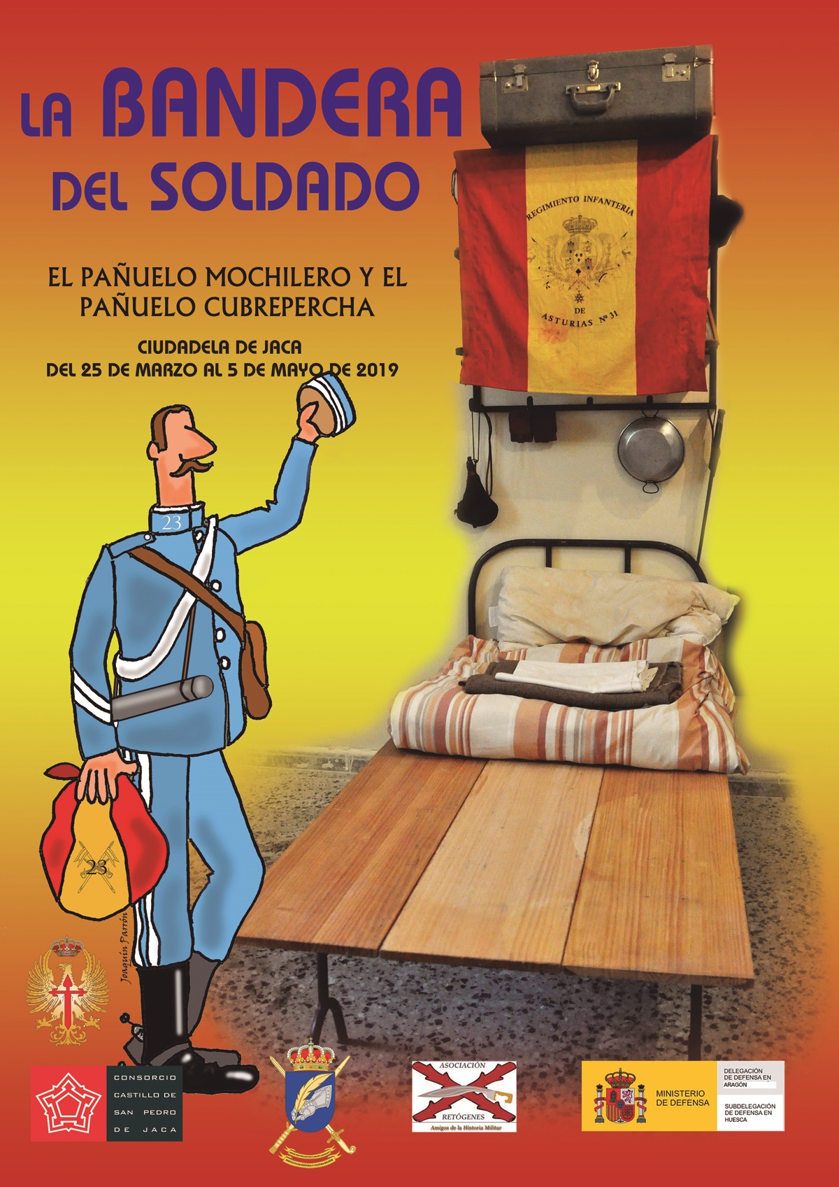 El próximo día 25 de marzo inauguramos una nueva exposición temporal en el Salón Panadería de la Ciudadela de Jaca titulada “La Bandera del Soldado, el pañuelo mochilero y el pañuelo cubrepercha”.