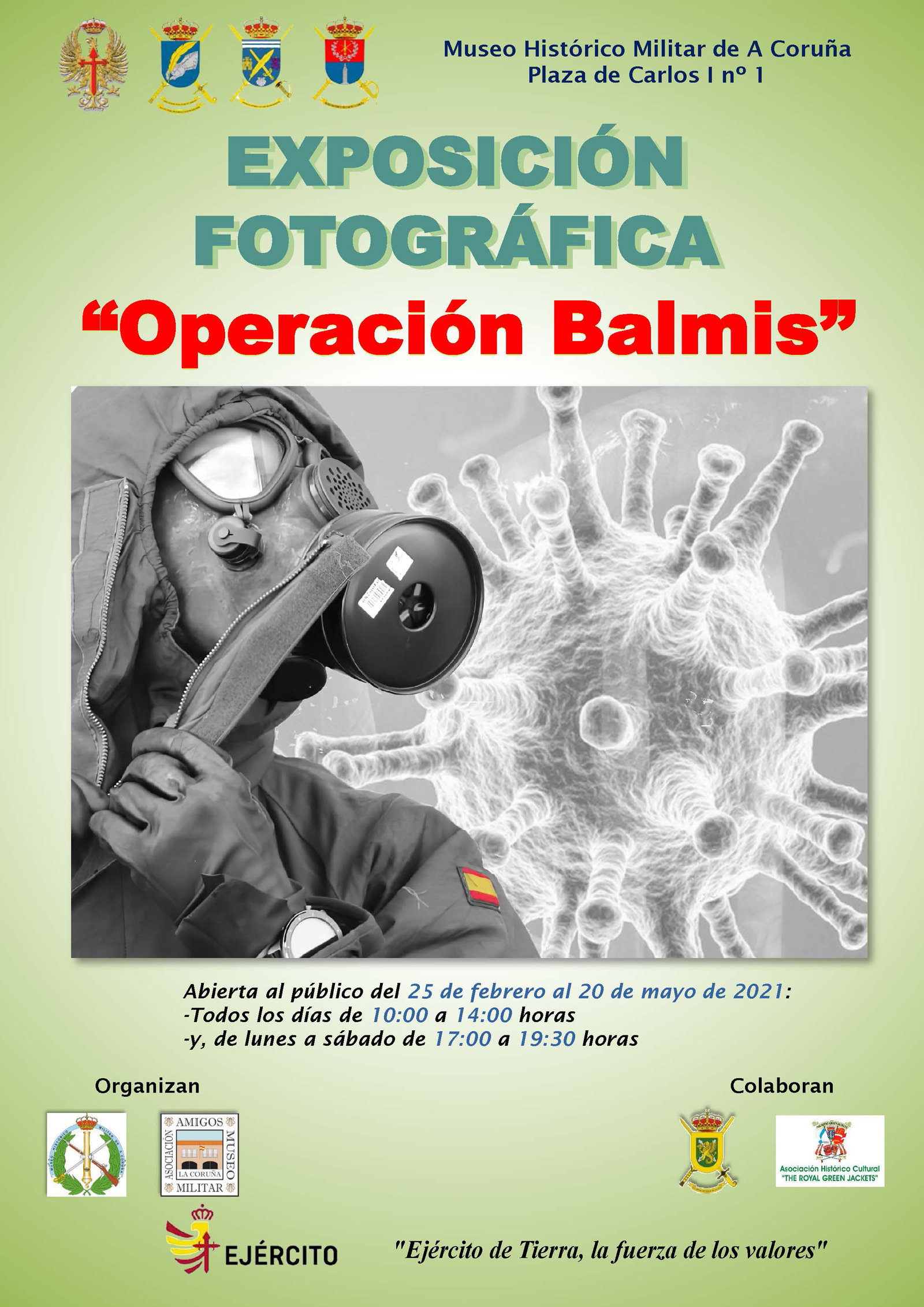 La operación, que comenzó el día 15 de marzo de 2020 (“Operación Balmis”) contó con más de 2.500 efectivos desplegados pertenecientes a los tres Ejércitos, UME y Guardia Real en diferentes localidades de toda España para hacer frente al COVID-19. En la muestra, 24 fotografías reflejan la labor en diferentes cometidos que las fuerzas armadas desempeñaron en dicha operación.
