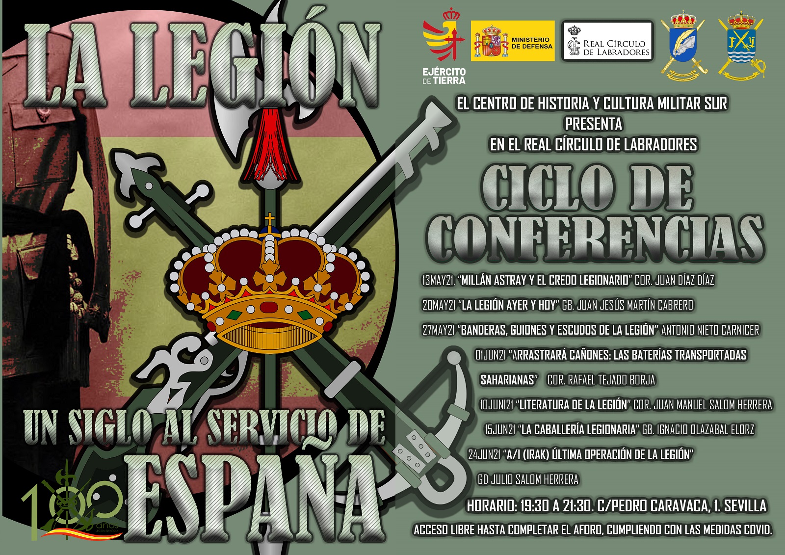 Como actividad paralela a la Exposición Temporal “La Legión, un siglo al servicio de España”, el CHCM Sur organiza un ciclo de siete conferencias, con el mismo título, que tendrá lugar en el Salón Real del Círculo de Labradores de Sevilla, desde el 13 de mayo al 24 de junio, en horario de 19.30 a 21.00 horas.