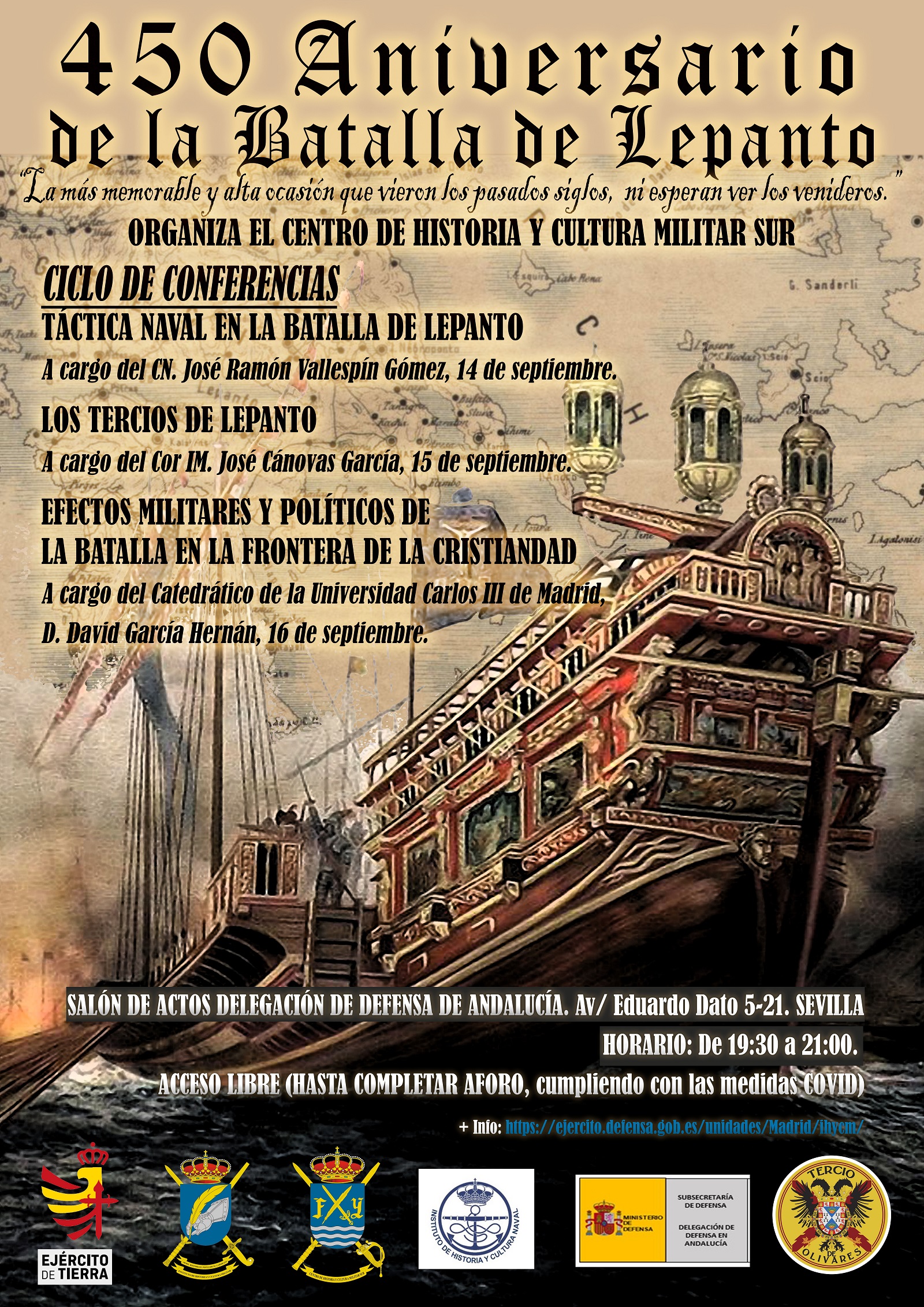 Al mejorar la condiciones sanitarias, el Centro de Historia y Cultura Militar Sur retoma el compromiso adquirido de conmemorar el 450 Aniversario de la Batalla de Lepanto, con el mismo ciclo de conferencias, que ahora se celebrarán en la sala de conferencias de la Delegación de Defensa de Andalucía–calle Eduardo Dato 5-21 Sevilla-, los días 14, 15 y 16 de setiembre a las 19.30 horas.