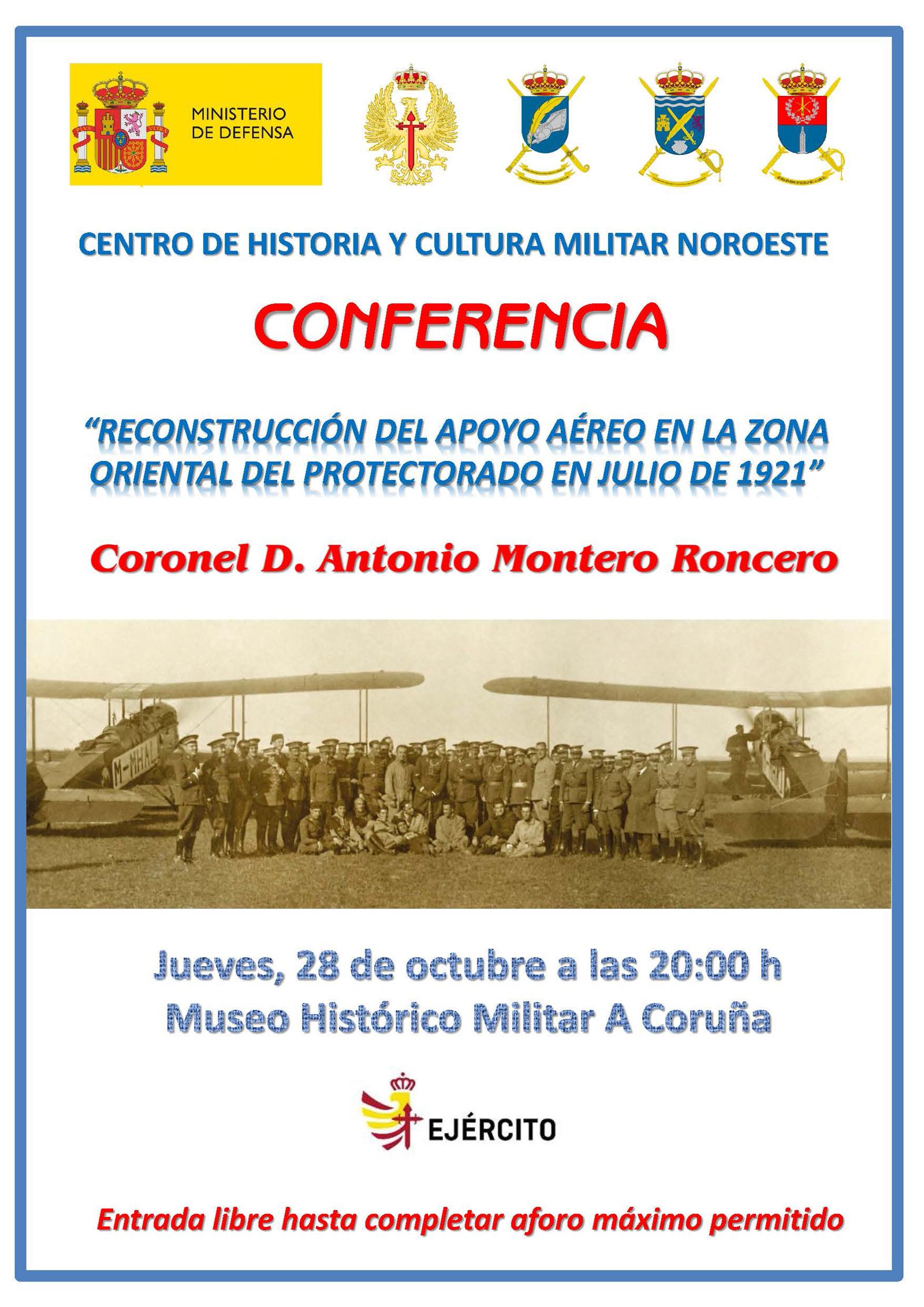 El Museo Histórico Militar de A Coruña es el escenario elegido para que el próximo 28 de octubre, a las 20:00 horas, el coronel D. Antonio Montero Roncero, Director de la Biblioteca Histórico Militar de A Coruña, imparta una conferencia en la sala Multiusos del Museo Histórico Militar, con el título “Reconstrucción del apoyo aéreo en la zona oriental del Protectorado en julio de 1921”.