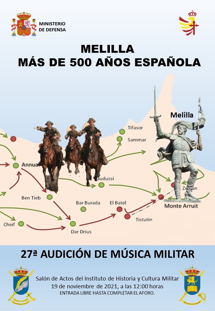 El próximo día 19 de noviembre a las 12:00 horas está previsto que se celebre en el Salón de Actos del Instituto de Historia y Cultura Militar la 27ª audición de música militar titulada: "Melilla. Más de 500 años española".