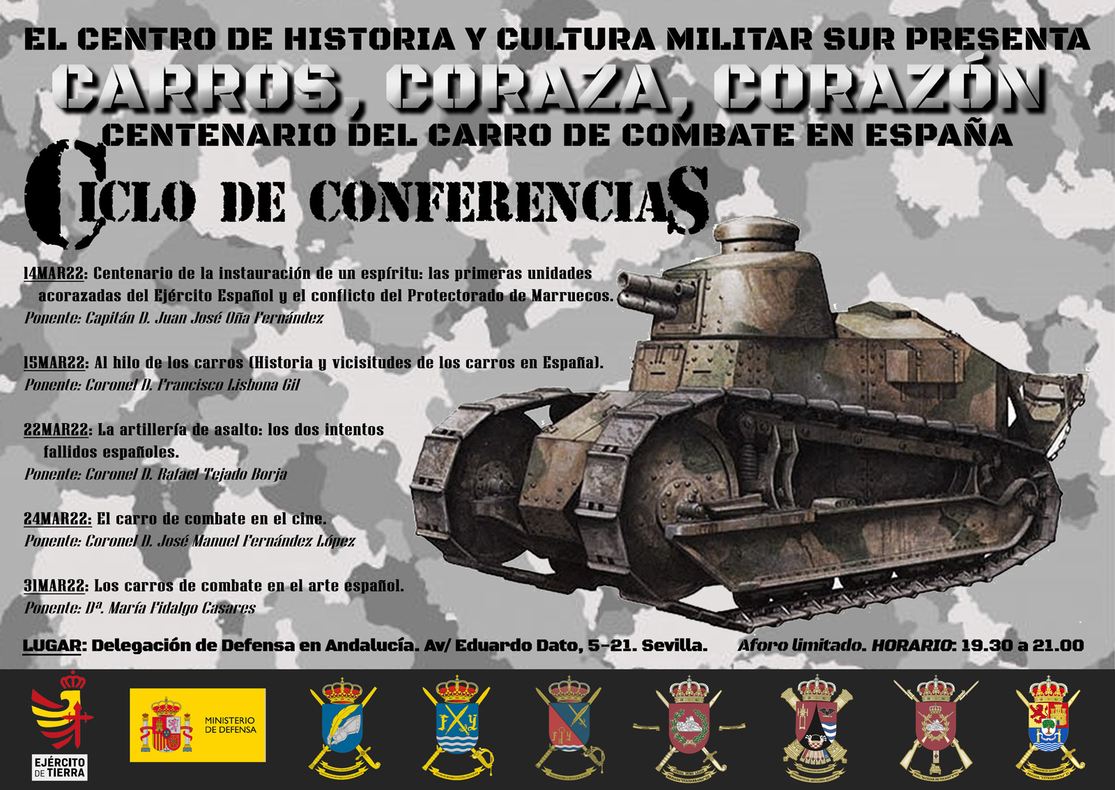 El Centro de Historia y Cultura Militar Sur, como actividad complementaria a la Exposición Temporal “Carros, Coraza, Corazón. Centenario del Carro de Combate en España” organiza un ciclo de cinco conferencias, con el mismo título, que tendrá lugar en la Delegación de Defensa en Andalucía.
