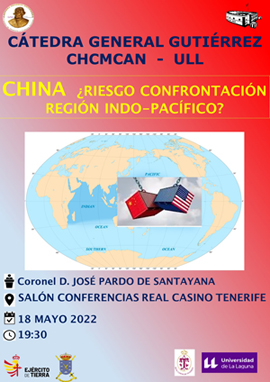 La Cátedra General Gutiérrez, ofrecerá el próximo 18 de mayo a las 19:00 horas en el Real Casino de Tenerife una conferencia que bajo el título de “China. Riesgo de confrontación en la región Indo-Pacífico”, tratará de acercarnos a esta nueva realidad mundial.