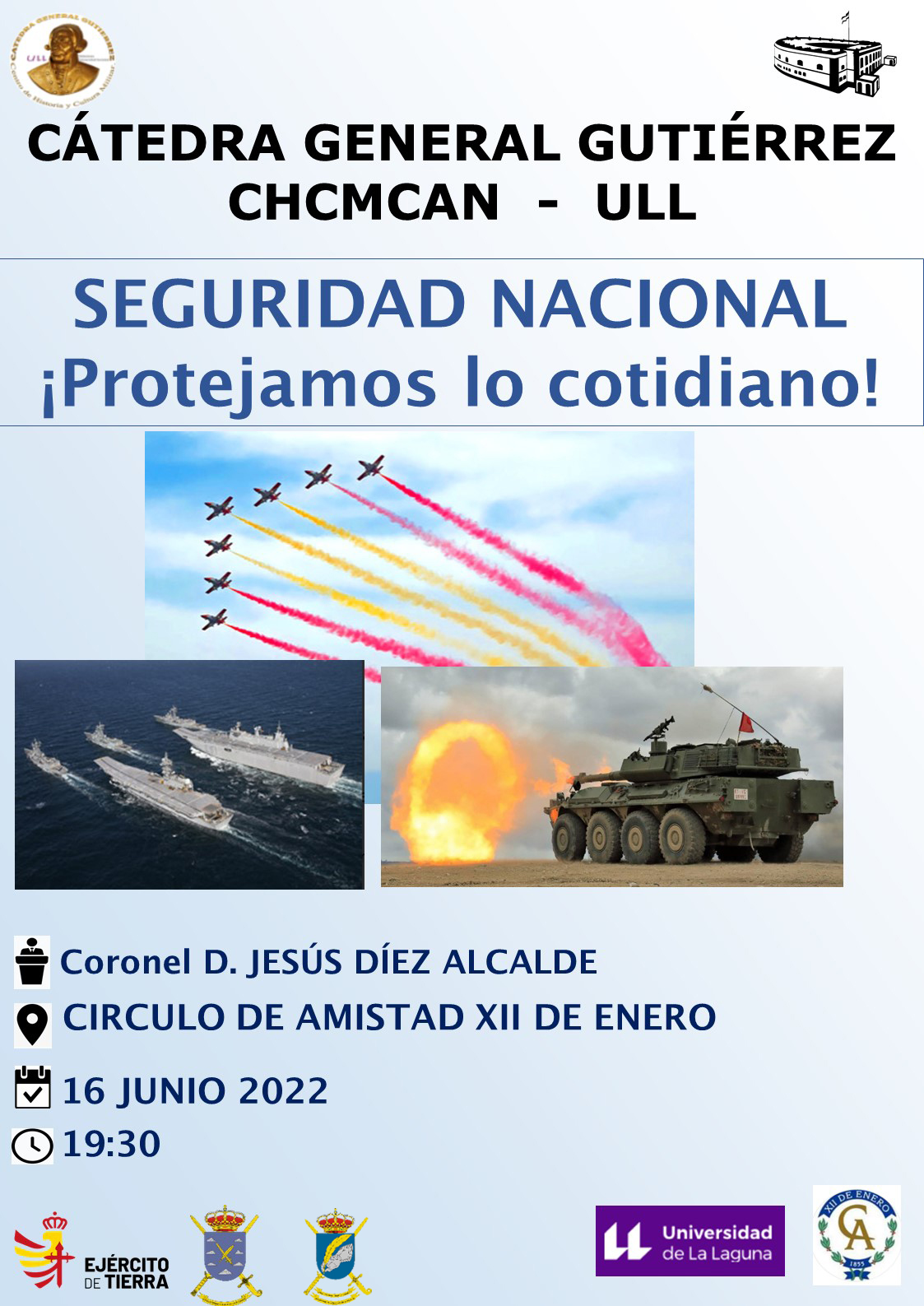 El próximo 16 de junio, a las 19:30 horas, la Cátedra General Gutiérrez (Centro de Historia y Cultura Militar y Universidad de La Laguna) organiza una conferencia que, bajo el título Nueva Ley de Seguridad Nacional. ¡Protejamos lo cotidiano! tendrá lugar en el Salón de Actos del Circulo de Amistad XII de Enero.