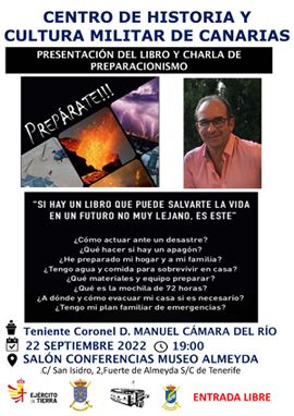 Presentación del Libro PREPÁRATE!!! Prepara a tu Famila para sobrevivir a Desastres y Emergencias; será presentado el próximo día 22 de septiembre a las 19:00 horas en el salón de conferencias del Museo de Almeyda (C/ San Isidro 2 Fuerte de Almeyda S/C de Tenerife) con entrada libre.