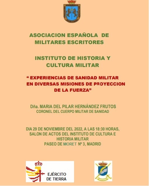 En el marco del Ciclo de Conferencias AEME/2022, el martes 29 de noviembre a las 18:30 horas, en el salón de actos del Instituto de Historia y Cultura Militar, tendrá lugar la conferencia: “EXPERIENCIAS DE SANIDAD MILITAR EN DIVERSAS MISIONES DE PROYECCIÓN DE LA FUERZA”