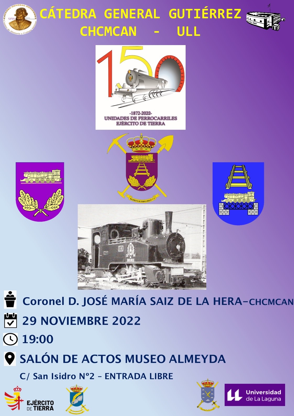 Con motivo de la celebración de la Efemérides Principal del Ejército de Tierra del 150º Aniversario de la creación de las unidades de ferrocarriles militares se tiene previsto impartir una conferencia e inaugurar una exposición alegórica a dicha efemérides.