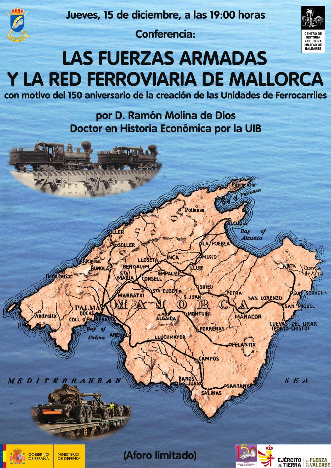 El próximo jueves 15 de diciembre, a las 19.00h, en el Centro de Historia y Cultura Militar de Baleares, se impartirá la conferencia "Las Fuerzas Armadas y la Red Ferroviaria de Mallorca" por D. Ramón Molina de Dios, al conmemorarse en el presente año el 150 Aniversario de la creación de las Unidades de Ferrocarriles del Ejército de Tierra.