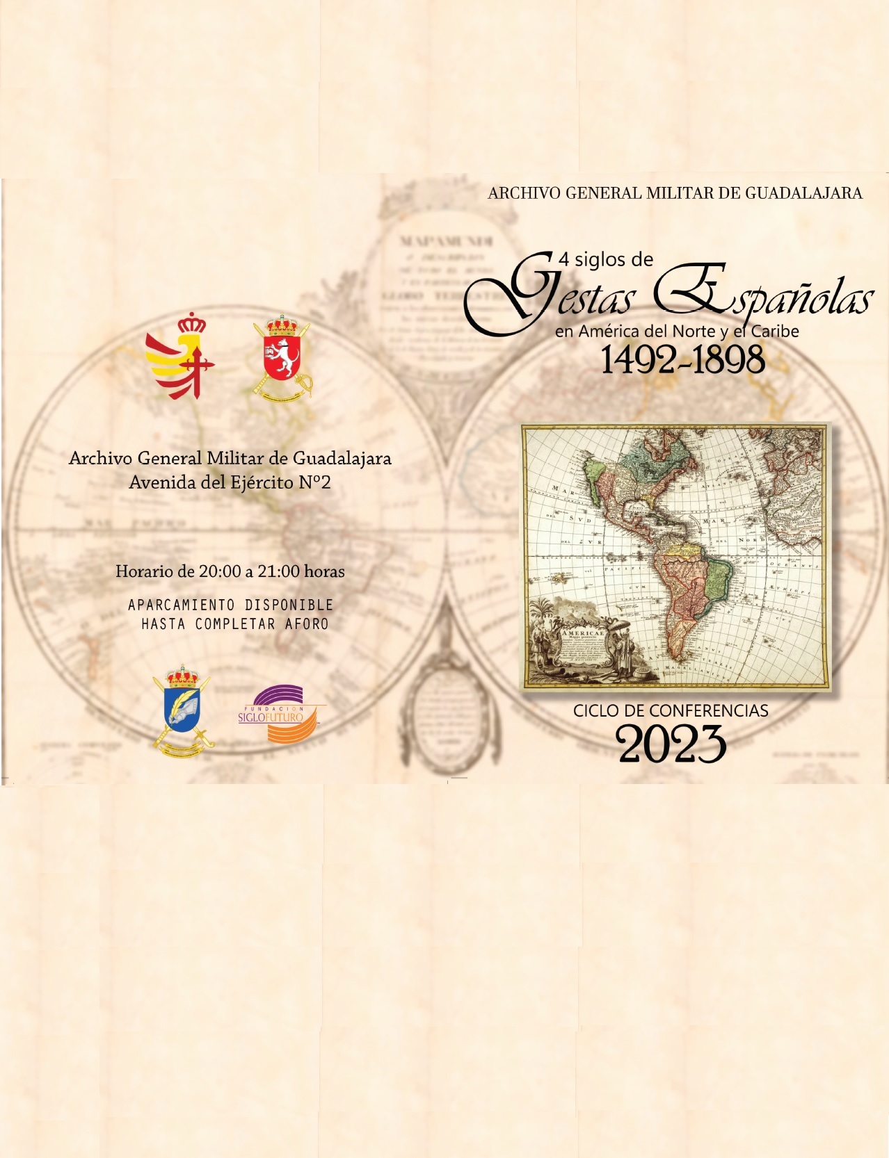 Como una de las actividades de Difusión Cultural organizadas por este Centro, y desarrollando la Efeméride principal marcada por el Ejército de Tierra para este año 2023, el Archivo General Militar de Guadalajara en colaboración con la Fundación Siglo Futuro, organiza, el primer Ciclo de Conferencias de Historia Militar titulado “4 siglos de Gestas Españolas en América del Norte y el Caribe, 1492-1898”. La primera conferencia tendrá lugar día 23 de marzo a las 20:00 h. en el Salón de Actos del Archivo General Militar de Guadalajara.